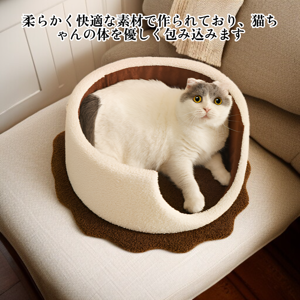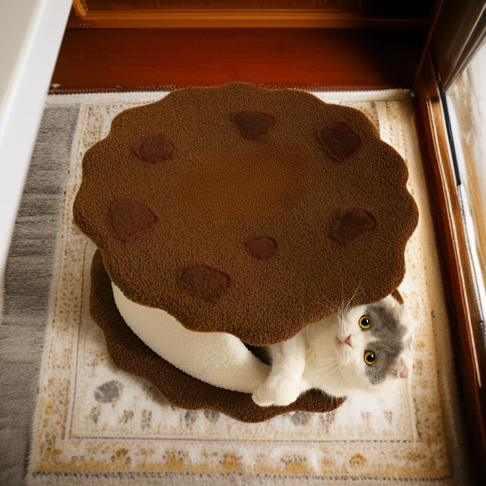 ● 秋冬に最適な防寒設計で、愛猫を寒さからしっかり守るサンドクッキー型猫ベッドです。